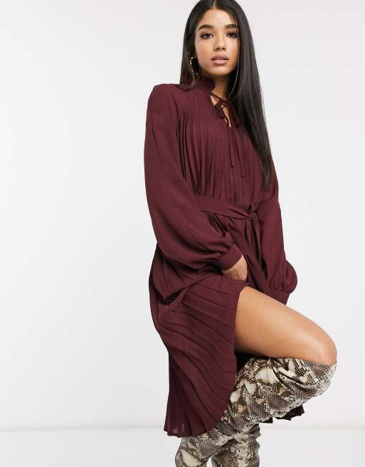 Na Kd Tie Waist Pleated Mini Skater Dress In Burgundy Asos